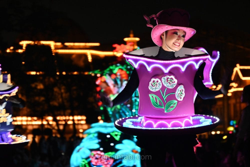 キャストさんは、まるでティーカップの中にいるかのような衣装をまとい、映画『ふしぎの国のアリス』の幻想的でユーモラスな世界観を表現しています。ピンクや紫を基調としたライトが輝き、キャストさんの笑顔とともに、夜のディズニーランドを一層魅力的に彩ります。
